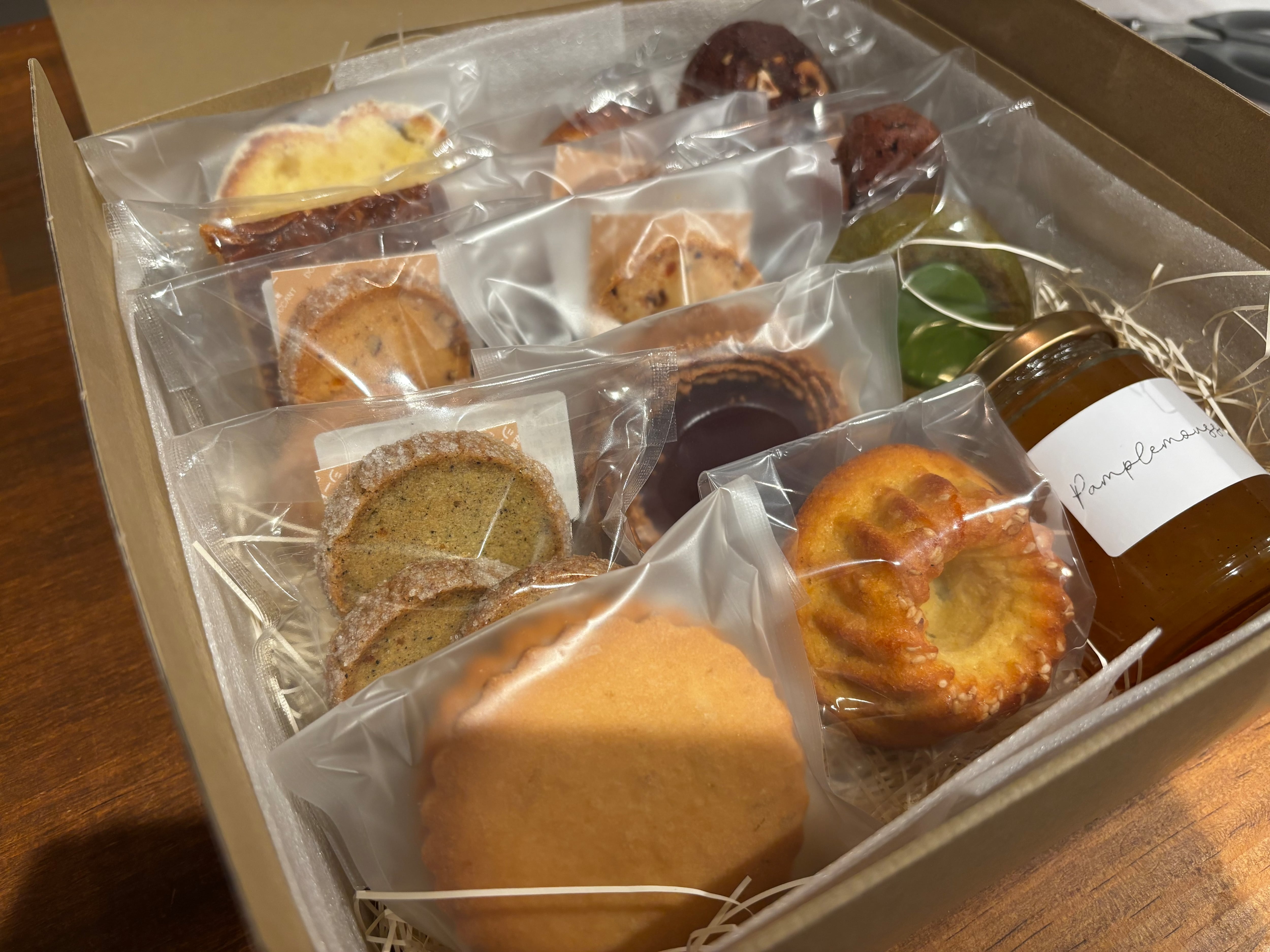 グレープフルーツのコンフィチュール1つと、袋に入った焼き菓子13個が入ります。